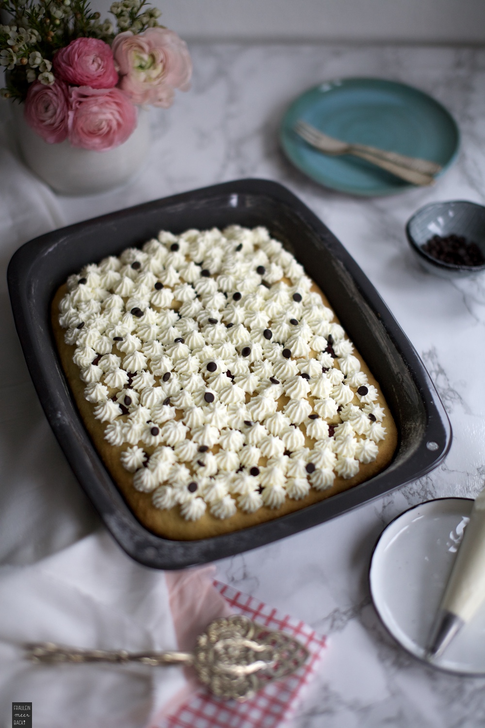 Weil ich keinen Spritzbeutel habe, habe ich eine Mascarpone-Quark-Eierlikör-Creme auf dem Kuchen verteilt, das Ganze (damit es wenigstens ein kleines bisschen chic aussieht) mit Kakao bestäubt. Und ratz-fatz war der Kuchen aufgegessen!